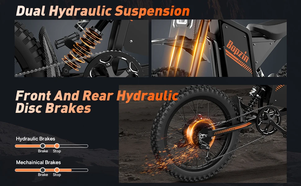 Superior Off-Road Safety: The electric dirt bike features 25.0x3.0" anti-slip, puncture-resistant fat tires that deliver exceptional traction and stability on any rugged terrain for the ultimate riding experience. Dual hydraulic brakes and the EABS control system comprehensively ensure off-road safety and an extreme experience, providing precise braking in any emergency situation—everything under your control. LED headlights and taillights keep you visible and safe during nighttime rides.