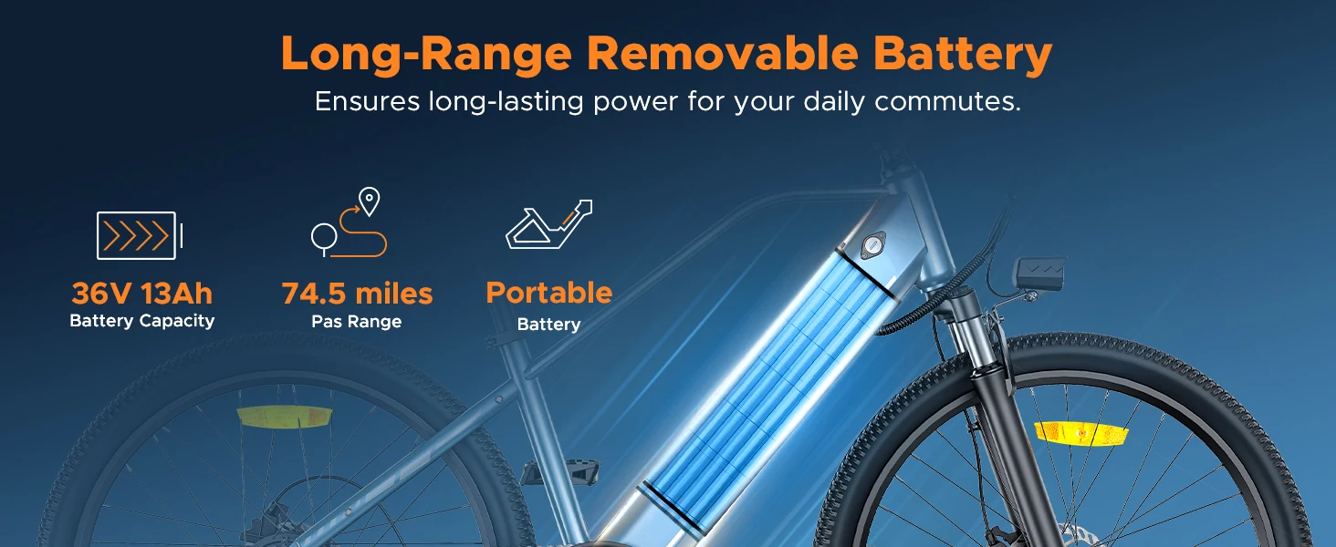Long-Range Battery – 36V 13Ah removable lithium battery, up to 72.5 km range with pedal assist
